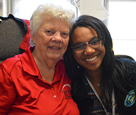Freshman Alexis Thomas walked up to Fischer for a quick hello and a noontime hug. “Every day I come down to lunch and she always has a smile on her face,” Alexis said. “She serves the best food and she keeps me motivated.”