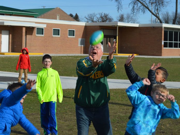 At Central Elementary School, the spontaneity on the playground pings around grandparent Ernie Sandona, who’s at the center of the dance. His grandson, third-grader Evan Mann, and his friends clamor for the football, running and throwing, catching and celebrating.