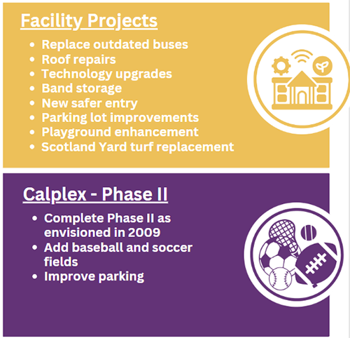 The supplemental bond funds are also planned to complete existing projects from the 2020 bond, including renovating facilities, upgrading technology and security, and for Phase 2 of the Calplex athletic complex.