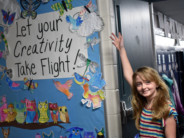 The tour moved on to the upper elementary wing, which includes grades 3-5. The guides pointed out the art room and talked about the safety awards on the lockers.