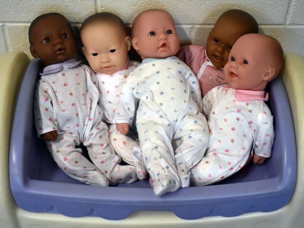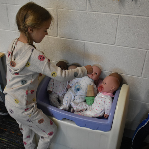 “(The students) love the baby dolls,” St. Pierre said. “They carry the babies around while pretending to talk on the phone or feed and rock them. They’re modeling what they see at home or in the real world.”