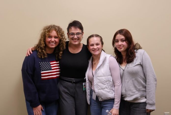 Byron Center High School rising senior Holly Lawrence, Lee High School 2025 graduate Isabel Landero-Mottus and Rockford High School 2025 graduate Annabelle Vitkauskas talk with Walczak about their aspirations and how what they are learning now in school will help them achieve their future goals.
