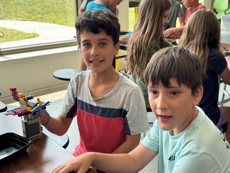 The rest of the students in the group weren’t far behind Eli and Gibson. In another corner of the cafeteria, fifth-graders Harrison Bertram and Grayson Grinelle put the finishing touches on their plane.