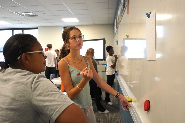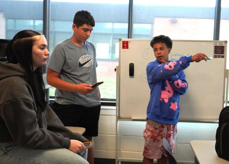 The Freshman Algebra class bustled with similar activity as students worked in groups of three on problems, figuring out patterns and writing equations on their own whiteboards.