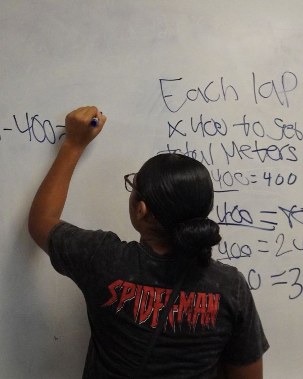 “The pattern is going up by 400,” he said, as the trio compared numbers on a chart indicating the distance of a lap. One lap equals 400 meters, two laps equals 800 meters and so on, they noticed.