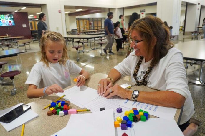South and Grand View elementaries held a “Math in Action” open house last week to share more information about the program and to give parents and kids the chance to do some hands-on problem-solving together. Families, like Leland and his dad, got to rotate through stations where they worked on actual assignments found in unit one of Illustrative Math lessons.