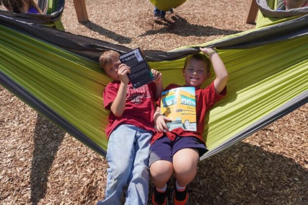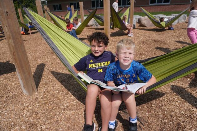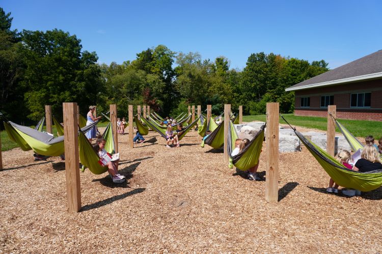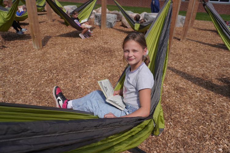 Third-grader Hayden Kohl was so focused on reading and first-grader Maizie Barle on listening that they barely looked up from their spot nestled in a comfy hammock during the half-hour outside.