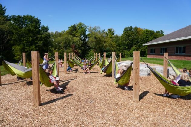 Murray Lake’s hammock garden is a brand new addition to the school, installed this summer by volunteers after receiving funding from the Lowell Education Foundation and contributions from various other sources. Along with the hammocks that hang from wood posts over wood chips, the garden features rock seating and, come fall when the leaves are bare, will have a view of the lake. Principal Molly Burnett said future plans are to add a chalkboard or whiteboard, plant trees and bushes and possibly add a sun shade.