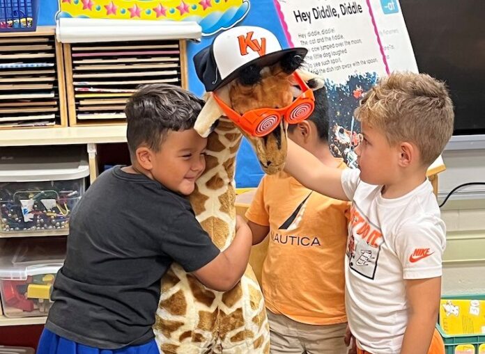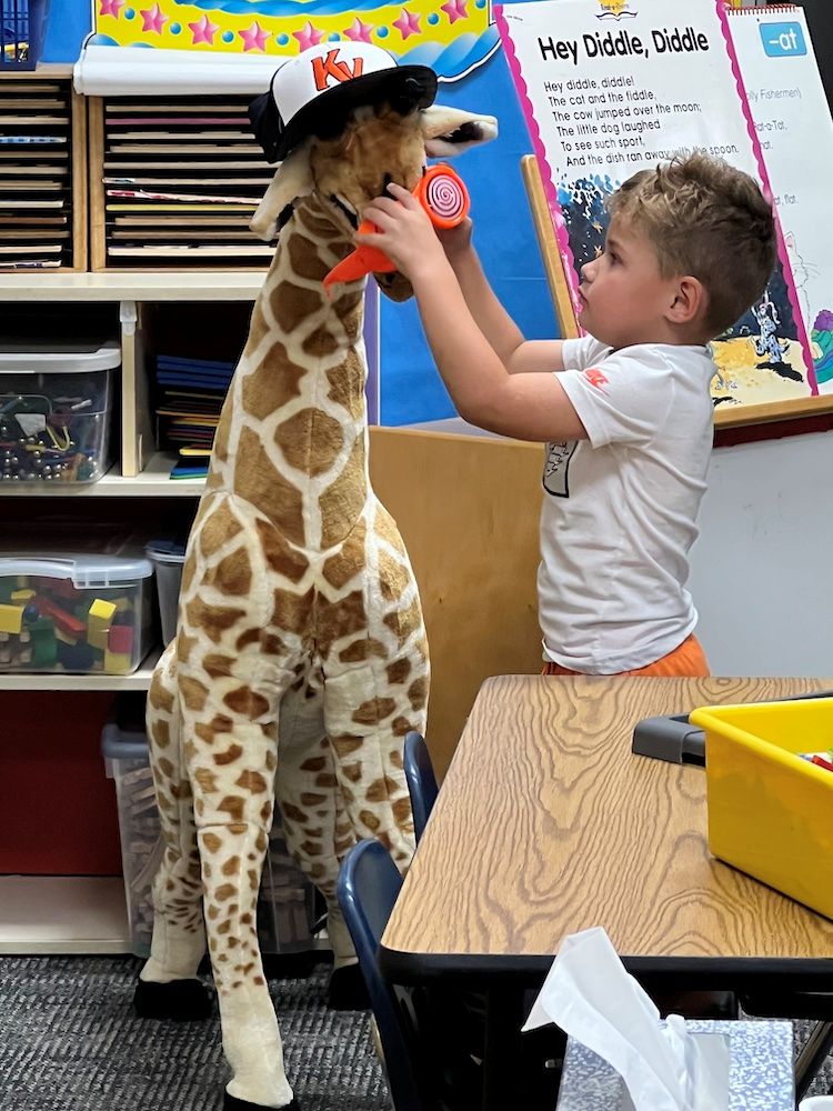 The large stuffed giraffe was going to have a week-long stay as a reward for Sokol’s class having the best attendance for the week.