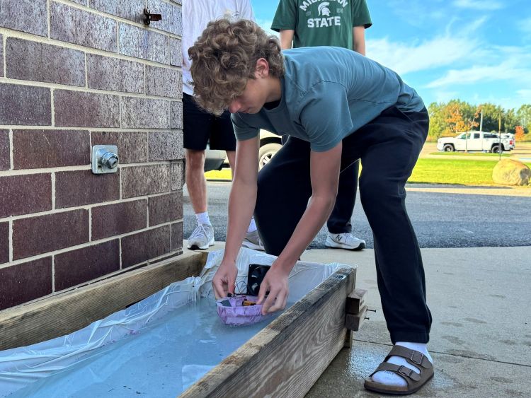 The high-schoolers gathered in an outdoor space just outside Groh’s room to set their boats in the water. Cheering and jeering, they watched as many of their classmates’ vessels stalled, bumped against the walls of the trough and tipped over.