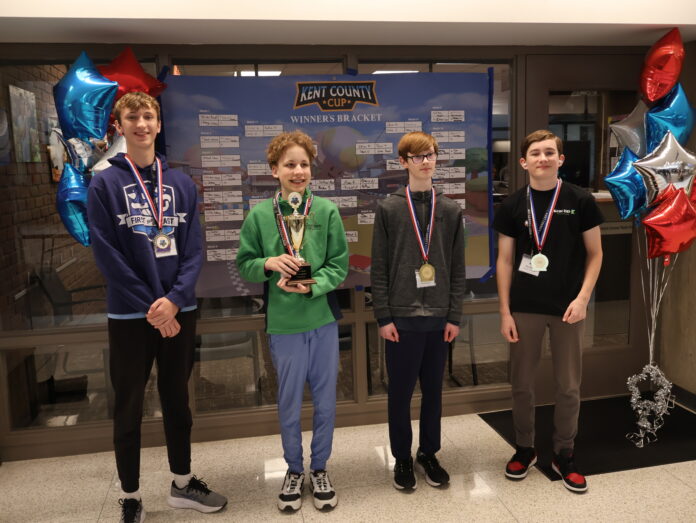 Taking home the trophy and medals were first-place winner Mason Abbott, a freshman who is homeschooled; second-place winner Gavin Nelson, a sophomore from Caledonia High School; third-place winner Reuben Starnes, a sophomore from East Kentwood High School; and fourth-place winner Josiah Bray, a sophomore from Grand Rapids Christian High School.