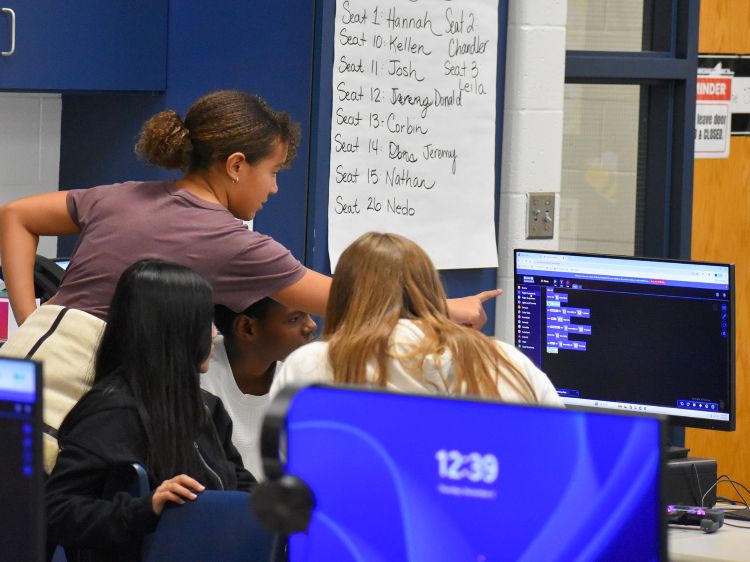 Students learned how to order a series of flight commands on their computers, which communicated directions to the drone. They could decide how fast or far the drone traveled once it was airborne, and change the colors of the LED lights.