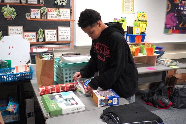 Recently, sixth-grader Isaiah Houston sorted through a donation box, examining and pricing items.