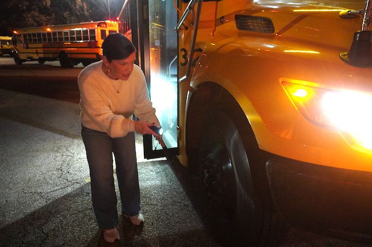 She tested the air brakes, door and lights, started the bus and logged everything into My Ride K-12, the system that also provides route maps and tracks students boarding and exiting. She then walked around the bus, using a baton to check tire pressure and looking underneath for leaks. With safety checks done, she pulled out around 6:30 a.m.