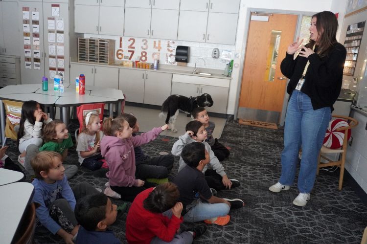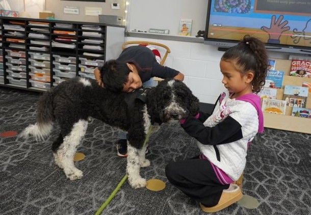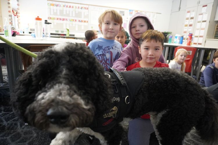 Comstock Park — It was time for a video in Stoney Creek Elementary teacher Grace Olsson’s first-grade class, but students first took time to greet, pet and hug the star of the show: Parker the therapy dog.