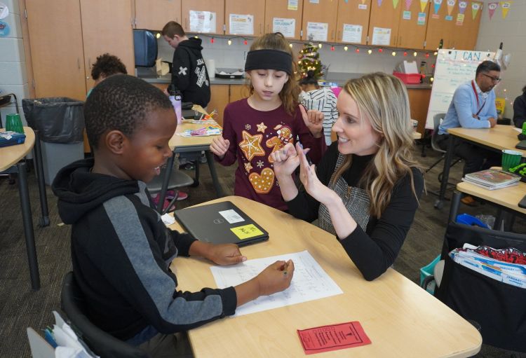 At Meadowlawn Elementary, about three miles away from Steketee’s East Kentwood High classroom, third-grade National Board certified teachers Lindsey Greenfield and Annie Hammill were also teaching math across the hall from each other.