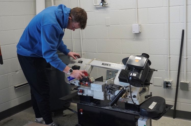 As Jesse talked, he was working on creating a set of aluminum bars, called parallels, to be used in vise jaws so the mechatronics class could make keychains for the upcoming Tech Center open house. While making the one-inch parallels, Jesse demonstrated his knowledge of numerical controls using a computer numerical control, or CNC, machine and a manual Klutch metal band saw.