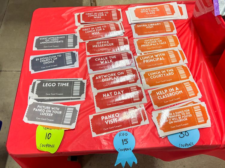 Students can also choose from a variety of coupons to redeem for LEGO time; a photo with the school’s therapy dog, Panko; a spot at the front of the lunch line for a week; or the opportunity to paint their teacher’s or principal’s face.