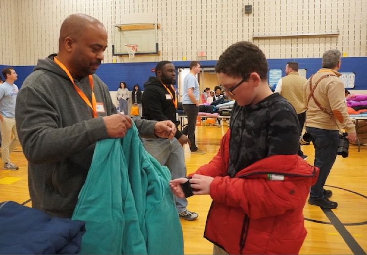 Operation Warm provided coats in a range of sizes, organized by size on tables in the gym.