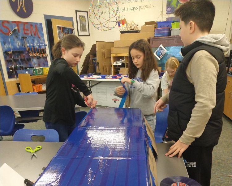 Fifth-graders in teacher David Oudbier’s STEM classes spent time in January and early February working together in small groups to plan, design and build their own bobsleds using only cardboard boxes, tape and their own imaginations.
