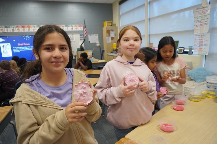 Next, students created fossil casts by pressing dinosaur shapes into clay and pouring plaster into the indentations. After the plaster had dried over several hours, they removed the casts to reveal their creations.