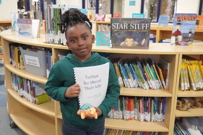 Kelloggsville — Mai’Son Keits likes turtles. So the second-grader decided to write a book about them, and now he has his classmates reading about turtles too.