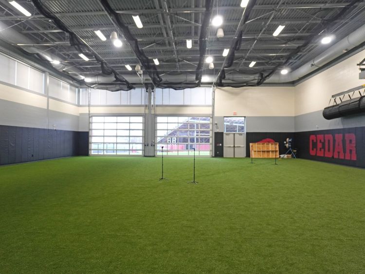 The fitness center addition is divided into two spaces: One side is a turf field, with batting cages that lower from the ceiling; the other side is a 20-station weight room and exercise area. The center also features a state-of-the-art sound system and TV monitors.