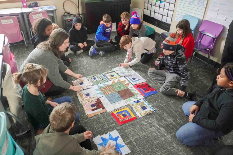 The third- and fourth-graders in Sarah McCormack’s Field School class at West Oakview Elementary recently created and pieced together a class quilt based on their study of the Underground Railroad and its Michigan ties. The state played a key role in the 19th-century network that helped enslaved people escape to free states, due to its proximity to the Great Lakes.
