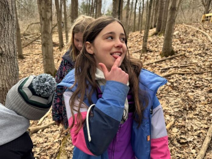 The students trudged out along the muddy trails behind the school to show off the maple trees, many of which were still leaking sap. They touched the trees, gathered a bit on their fingers and tasted it.