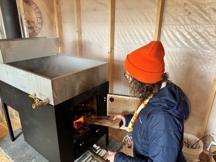 “This is where we hold all the sap that we’re going to turn into syrup. Then we take the sap out and we warm it up to then put in there,” she said, pointing to a woodstove-heated evaporator. “And then we turn it into syrup.”