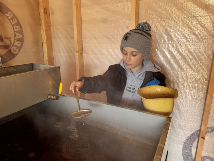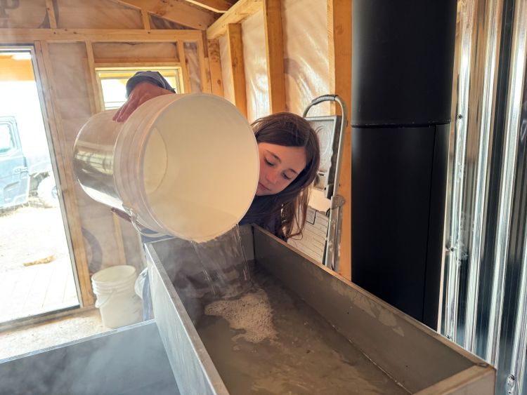 “Basically, all the water is evaporating out of this, so the sugar stays in,” Andrew said as he grabbed a net to collect some of the foam from the surface of the evaporating sap.