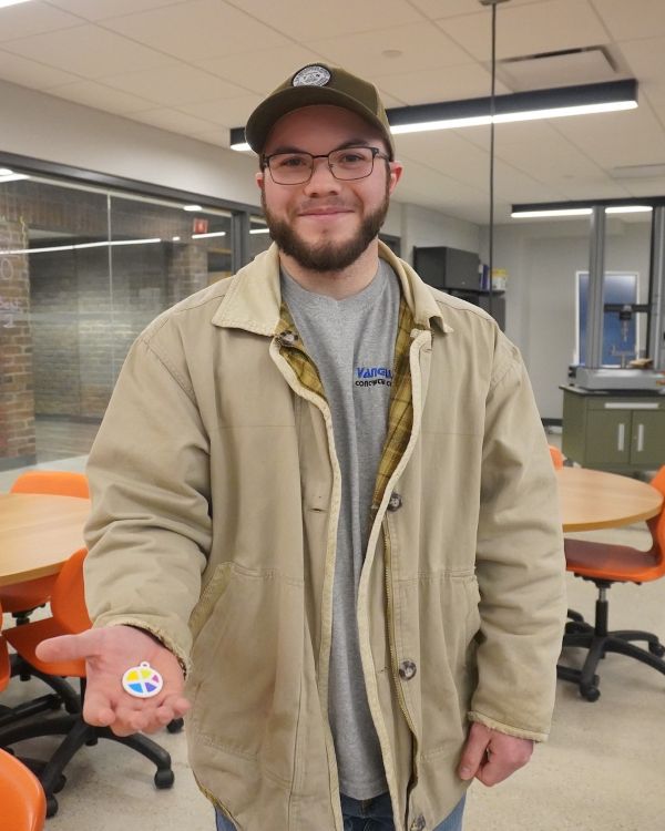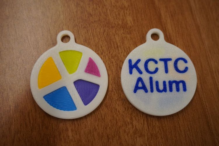 “I used the KCTC logo — the circle with colors — as the basis for my design,” he said. “Because the (3D) printer is a single nozzle, I made each color of the circle a different height so that the nozzle didn’t need to change the filament as often and would create less waste.”