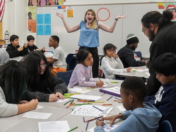 Godfrey-Lee — Hunkered over a table in Lee Middle School’s art room, second-grade scientists pondered what would happen if they poured three colors of a water and vinegar solution into a bin with heaping spoonfuls of baking soda.