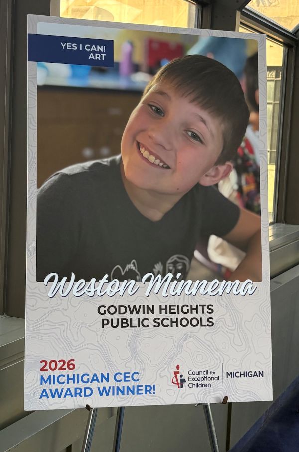 Weston’s passion for drawing recently earned him a Yes I Can! Award in art from the Michigan Council for Exceptional Children. The statewide award recognizes students with disabilities for their achievements, perseverance and potential, made possible through their hard work and the collective support of district staff, said Derek Cooley, Godwin Heights director of special education.